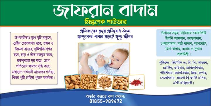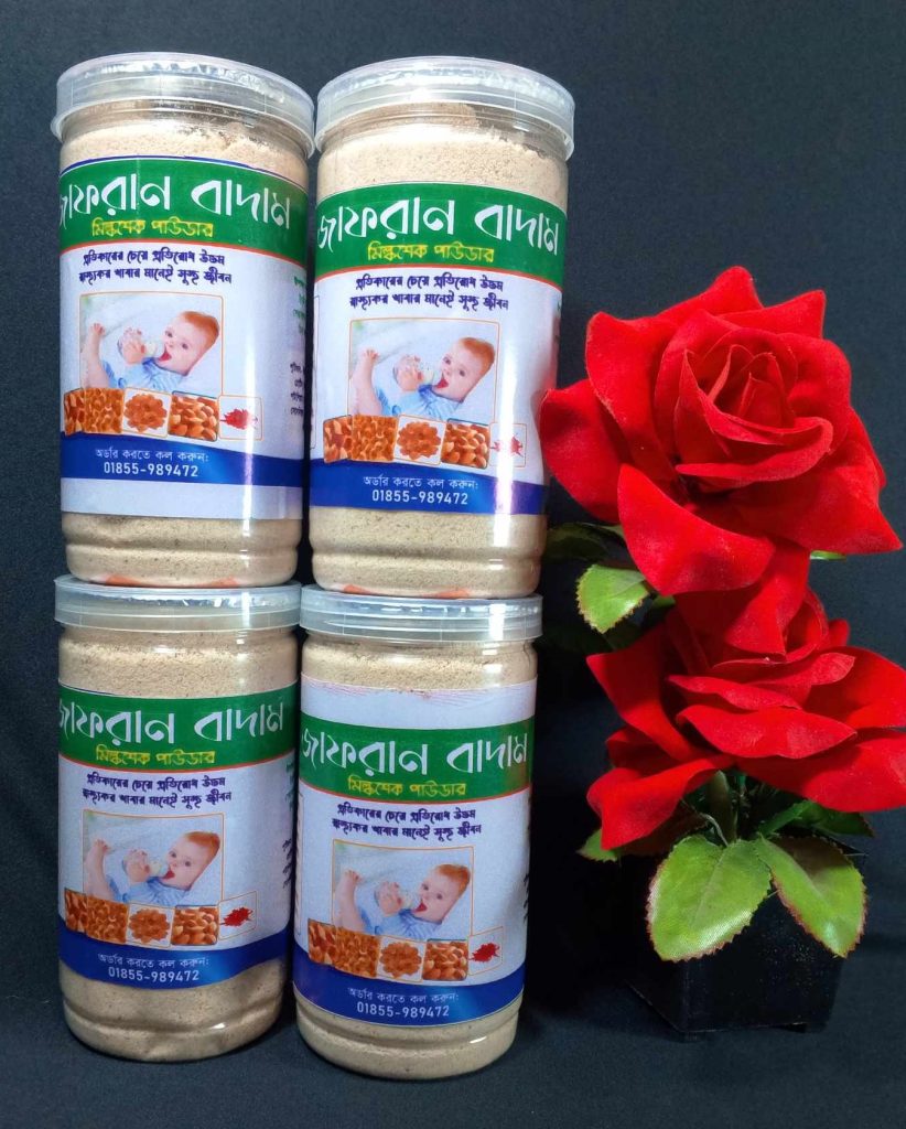 শিশু বিশেষজ্ঞ ডাক্তার ও পুষ্টিবিদের পরামর্শে তৈরি ন্যাচারাল পুষ্টিকর জাফরান বাদাম মিল্কশেক পাউডার।